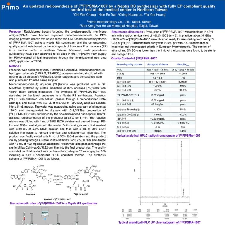 An updated radiosynthesis of [18F]PSMA-1007 by a Neptis RS synthesizer with fully EP compliant quality control test at the medical center in Northern Taiwan.