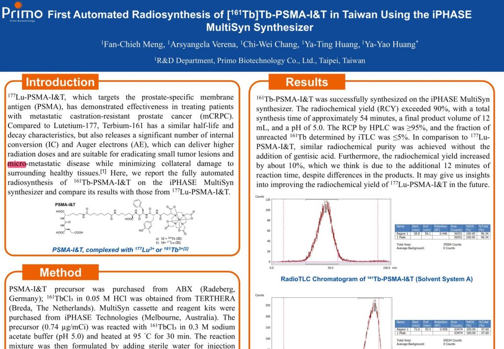 First Automated Radiosynthesis of [161Tb]Tb-PSMA-I&T in Taiwan Using the iPHASE MultiSyn Synthesizer Home / 最新消息 / First Automated Radiosynthesis of [161Tb]Tb-PSMA-I&T in Taiwan Using the iPHASE MultiSyn Synthesizer Publications 2025-11-01 1Fan-Chieh Meng, 1Chi-Wei Chang, 1Arsyangela Verena, 1Ya-Ting Huang,1Ya-Yao Huang* 1R&D department, Primo Biotechnology Co., Ltd., Taipei, Taiwan Introduction: 177Lu-PSMA-I&T, which targets the prostate-specific membrane antigen (PSMA), has demonstrated effectiveness in treating patients with metastatic castration-resistant prostate cancer (mCRPC). Compared to Lutetium-177, Terbium-161 has a similar half-life and decay characteristics, but also releases a significant number of internal conversion (IC) and Auger electrons (AE), which can deliver higher radiation doses and are suitable for eradicating small tumor lesions and micro-metastatic disease while minimizing collateral damage to surrounding healthy tissues. Here, we report the fully automated radiosynthesis of 161Tb-PSMA-I&T on the iPHASE MultiSyn synthesizer and compare its results with those from 177Lu-PSMA-I&T. Method: PSMA-I&T precursor was purchased from ABX (Radeberg, Germany); 161TbCl₃ in 0.05 M HCl was obtained from TERTHERA (Breda, The Netherlands). MultiSyn cassette and reagent kits were purchased from iPHASE Technologies (Melbourne, Australia). The precursor (0.74 µg/mCi) was reacted with 161TbCl₃ in 0.3 M sodium acetate buffer (pH 5.0) and heated at 95 °C for 28 min. The reaction mixture was then formulated by adding sterile water for injection containing sodium L-ascorbate (500 mg) and DTPA (1 mg), followed by sterile filtration into a product vial. The radiochemical purity (RCP) of the final product was determined using iTLC and HPLC. Results: 161Tb-PSMA-I&T was successfully synthesized on the iPHASE MultiSyn synthesizer. The radiochemical yield (RCY) exceeded 90%, with a total synthesis time of approximately 54 minutes, a final product volume of 12 mL, and a pH of 5.0. The RCP by HPLC was ≥95%, and the fraction of unreacted 161Tb determined by iTLC (Rf = 0.9–1.0) was ≤5%. In comparison to 177Lu-PSMA-I&T, similar radiochemical purity was achieved without the addition of gentisic acid. Furthermore, the radiochemical yield increased by about 10%, which we think is due to the additional 12 minutes of reaction time, despite differences in the products. It may give us insights into improving the radiochemical yield of 177Lu-PSMA-I&T in the future. Conclusions: The first fully automated synthesis of 161Tb-PSMA-I&T on the iPHASE MultiSyn has been successfully established in Taiwan. Stability studies at high activity concentrations are currently underway to ensure compliance with clinical criteria.