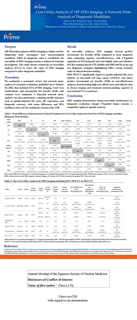 Cost-Utility Analysis of 18F-FDG Imaging: A Network Meta-Analysis of Diagnostic Modalities 首頁 / 最新消息 / Cost-Utility Analysis of 18F-FDG Imaging: A Network Meta-Analysis of Diagnostic Modalities 研究論文 2025-11-13 1Chen Li-Yu, 1Huang Ya-Ting ,2Fan Yu-Ming. 1 Primo Biotechnology Co., Ltd , Taipei, Taiwan. 2Department of Nuclear Medicine, Cardinal Tien Hospital, New Taipei City, Taiwan.. This study poster was presented at 2025 65th Annual Meeting of the Japanese Society of Nuclear Medicine (JSNM). Purpose: To assess the cost-utility of 18F-fluorodeoxyglucose (FDG) imaging versus other diagnostic tools. Procedure: A systematic review and Bayesian network meta-analysis were conducted using studies published up to Oct 25, 2022 Incremental net benefit (INB) was estimated under a standardized cost framework using QALYs, life expectancy, and diagnostic accuracy. Result: FDG imaging showed generally positive INBs, indicating favorable cost-effectiveness compared with most alternatives. CT-guided aspiration (CTG) had slightly higher INB due to its direct histological confirmation. In SUCRA ranking, CTG (0.685) and FDG (0.679) ranked highest. Integrated modalities like PET/CT had better cost-utility than PET or CT alone. Conclusion: FDG imaging is a cost-effective diagnostic strategy, supporting its use in clinical decision-making.