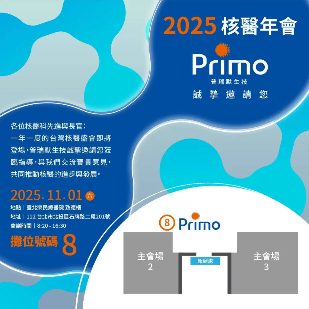 普瑞默以創新實力閃耀2025核醫年會舞台 首頁 / 最新消息 / 普瑞默以創新實力閃耀2025核醫年會舞台 最新活動 2025-11-01 普瑞默長期深耕核醫學領域,持續挑戰創新與品質的極限。今年,我們以卓越的研發成果與智慧製藥實力,驕傲登上 2025 核醫年會的舞台,更榮幸地有最新研究成果獲得大會收錄,成為業界矚目的焦點。 此次年會中,普瑞默將分享多項具里程碑意義的突破: 台灣首例Tb-161 RLT藥物自動化合成成功,展現普瑞默在技術整合與臨床應用上的先驅地位。 符合GMP 標準的智慧製藥工廠,以高效能生產與精準品質管理,打造放射性藥物製程的新典範。 深厚的放射性藥物研發與臨床轉化經驗,推動核醫藥物從臨床應用走向商業化量產,實現真正的醫療價值。 展望未來,普瑞默將持續以「創新、自動智能、精準」為核心,打造符合國際標準的放射性藥物製造體系,推動放射配體診療(RLT)邁向更精準、更安全的新時代。 目前我們已整合完整核醫放射藥物服務,從臨床前、臨床試驗、藥物開發、自動化合成到亞太配銷! 誠摯邀請您蒞臨現場指導與交流,一同探索核醫學的無限可能,攜手開啟精準醫療新紀元。 📅 活動資訊 ▸ 日期|2025年11月1日(星期六)8:20 ~ 16:30 ▸ 地點|臺北榮民總醫院 致德樓 ▸ 地址|112 台北市北投區石牌路二段201號 ▸ 攤位號碼|8 🎉 歡迎蒞臨普瑞默攤位,與我們面對面交流最新放射性藥物研發成果!