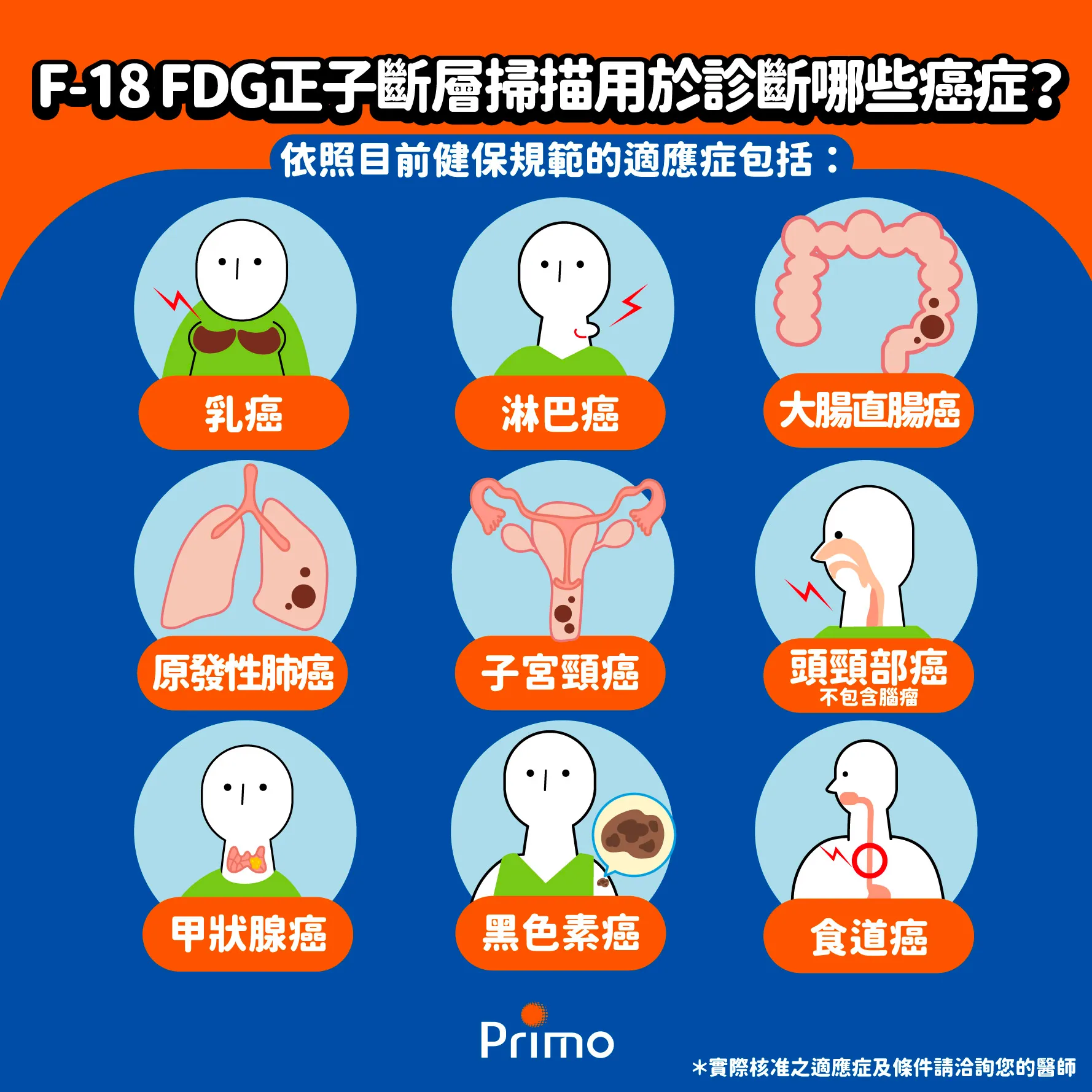 氟化去氧葡萄糖(F-18 FDG)用在哪些疾病? 首頁 / 精準醫療 / 氟化去氧葡萄糖(F-18 FDG)用在哪些疾病? 2023-09-11 F-18 FDG是什麼 「放射性氟化去氧葡萄糖(fluorodeoxyglucose;以下簡稱:F-18 FDG)」是一種核醫/正子放射性藥物,更是正子斷層造影(PET-CT)不可或缺的靈魂角色。由於F-18 FDG是循著人體內葡萄糖新陳代謝的路徑,只要以葡萄糖為養分來源的細胞就可以是它用來檢查的對象,這包括了許多惡性腫瘤(一般講的癌症)、腦部檢查、心臟檢查。因此我們可以說F-18 FDG是目前應用最廣的核醫放射性藥物。 用於癌症的診斷 F-18 FDG在惡性腫瘤(癌症)的應用,依照目前健保規範的適應症包括:乳癌、淋巴癌、大腸癌、直腸癌、食道癌、頭頸部癌(不包含腦瘤)、原發性肺癌、黑色素癌、甲狀腺癌及子宮頸癌 以上這些癌症的分期、治療及懷疑復發或再分期,而正確的分期才能選擇對病人最適當的治療。例如,在醫生施以治療前,以正子造影做全身性的檢查,當癌細胞有遠處轉移時,可能會先採取全身性化療,而非直接開刀切除癌細胞。又或者在開刀或放射線治療(電療)前,正子造影提供的影像,可更精準的確認治療範圍,並且接受過治療的病患,必須定期追蹤檢查,以確保病情沒有再復發,若癌症指數不斷升高時,必須考慮做更精準的診斷,正子造影就能提供很大的幫助。 其他癌症如胰臟癌與膽管癌,也可透過正子造影診斷,不過尚未列入健保給付的範圍內,只能採取自費檢查。 另外男性常見的攝護腺癌,因為它不是以葡萄糖做為養分來源,因此無法使用F-18 FDG進行檢查,必須改用其他針對攝護腺癌設計的核醫放射性藥物(如:普瑞默的F-18 PSMA攝護腺細胞膜抗原正子斷層攝影藥物)。 腦部疾病也適用嗎? F-18 FDG在腦部檢查的應用原理又與腫瘤檢查不太相同,由於人腦95%的養分來自碳水化合物,腦部活動愈活躍的地方,就會攝取並消耗愈多的葡萄糖。因此F-18 FDG也成為觀察腦部活動或疾病如失智症、癲癇、中風後的功能評估。雖然台灣健保沒有給付F-18 FDG的腦部失智症檢查,但是近年來,包括美國在內的歐美先進國家已經廣泛將F-18 FDG用於失智症檢查,並且將其譽為當今人類對於腦部新陳代謝活動最精準的檢查工具。不過,由於腦部對於葡萄糖利用的特性與腫瘤相似,因此腦瘤(還有肝癌也是因為類似的原因)並不適合使用F-18 FDG進行檢查。 心臟疾病也適用嗎? 當心臟肌肉因為供應養份的冠狀動脈阻塞而缺氧一段時間之後,心臟肌肉便會進入冬眠狀態進而壞死。在冬眠狀態下的心臟肌肉如果能夠透過繞道手術將大腿的動脈血管擷取一段殖入心臟做為養份供應的血管,那麼冬眠的心肌便有可能恢復一定的功能。但是因為這樣的繞道手術有一定的風險,因此在進行手術前,就必須找出存活的心肌並且評估是否值得進行繞道手術。 基於上述的原因,使用F-18 FDG找出存活心肌就成為繞道手術之前的一項重要參考資訊。由於心臟肌肉細胞的養份來源可以是游離脂肪酸與葡萄糖,透過葡萄糖負載(glucose loading)的方式,我們就可以找出大部分的冬眠心肌以及它可能的殘存比例。 總結F-18 FDG 應用範圍包括: 1. 乳癌、淋巴癌、大腸癌、直腸癌、食道癌、頭頸部癌(不包含腦瘤)、原發性肺癌、黑色素癌、甲狀腺癌及子宮頸癌這些癌症的臨床診斷分期、治療效果評估、復發追蹤監控,以及據此開發出的健康檢查。 2. 腦部的失智症、癲癇、中風後腦功能評估。 3. 心臟的存活心肌偵測。 注意事項 由於腫瘤細胞上有比較多的葡萄糖轉運蛋白,也有更多的血流供應,因此一旦注射F-18 FDG之後,以葡萄糖為養分來源的腫瘤會因此攝取大量的F-18 FDG而在影像上與正常細胞有非常大的差異。檢查前的劇烈運動、按摩與發炎的位置也會因為血液聚集而有較高的F-18 FDG攝取,因此在接受F-18 FDG檢查前的1~2週內應該避免這些活動,更詳細的說明,請參考:放射性氟化去氧葡萄糖(F-18 FDG)正子斷層造影前的準備事。 ■參考文獻: Positron Emission Tomography In Molecular Imaging, IEEE ENGINEERING IN MEDICINE AND BIOLOGY MAGAZINE。 Molecular and Multimodality Imaging in Cardiovascular Disease.